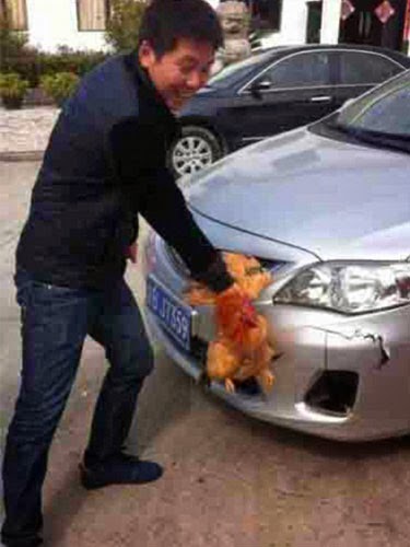 Huang memberhentikan kereta dan keluar untuk melihat apa terjadi. Dia terkejut apabila melihat lubang di bahagian badan kereta dan ayam terperosok di dalamnya. “Saya menjangka ayam itu mati tetapi saya mendengar ayam itu berbunyi dan membongkok untuk melihat lebih dekat. “Ayam itu tidak apa-apa,” katanya. Menurut Huang, ia boleh jadi iklan yang baik. “Ayam itu kelihatan sangat kuat dan kualiti kereta saya tidak bagus. “Saya merakam video dengan menggunakan telefon bimbit dan menyiarkannya dalam Internet.” - Agensi
