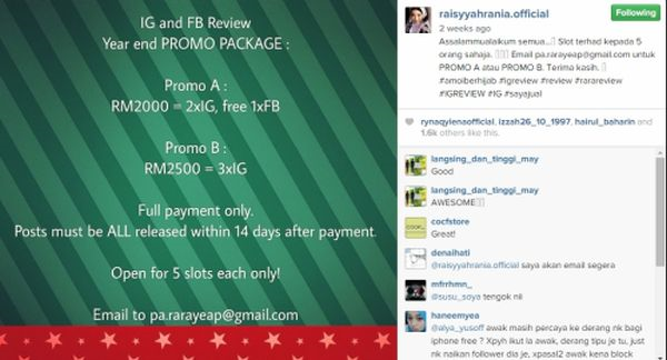 Dalam pada itu, model Raisyyah Rania (Felixia Yeap) yang mempunyai 214 ribu pengikut mengenakan caj mengikut pakej-pakej tertentu di mana dia akan membuat iklan sebanyak dua kali di Instagram dan sekali di Facebook dengan harga RM2,000. Bagi tiga kali periklanan di Instagram, model itu meletakkan harga RM2,500. Bagaimanapun penyanyi Fynn Jamal (408 ribu pengikut) meletakkan harga diantara RM200 hingga RM500 di mana caj yang dikenakan mengikut kemampuan peniaga Instagram berkenaan. Begitu juga dengan pengacara Nana Mahazan (177 ribu pengikut) yang meletakkan harga di bawah RM500 mengikut perbincangan yang dibuat dengan penjual iklan.Aktor Fizo Omar yang mempunyai 380,000 pengikut mengenakan caj di bawah RM1,000 dan akan memberikan diskaun pada masa-masa tertentu kepada mana-mana pengikut laman sosial berkenaan yang mahu mengiklankan produk mereka.